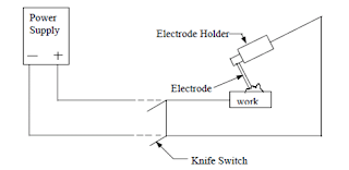 The power source should be a direct current machine rated at 300 or 400 amperes. Motor generator welding machines are most often used for underwater welding in the wet. The welding machine frame must be grounded to the ship. The welding circuit must include a positive type of switch, usually a knife switch operated on the surface and commanded by the welder-diver. The knife switch in the electrode circuit must be capable of breaking the full welding current and is used for safety reasons. The welding power should be connected to the electrode holder only during welding. Direct current with electrode negative (straight polarity) is used. Special welding electrode holders with extra insulation against the water are used. The underwater welding electrode holder utilizes a twist type head for gripping the electrode. It accommodates two sizes of electrodes. The electrode types used conform to AWS E6013 classification. The electrodes must be waterproofed. All connections must be thoroughly insulated so that the water cannot come in contact with the metal parts. If the insulation does leak, seawater will come in contact with the metal conductor and part of the current will leak away and will not be available at the arc. In addition, there will be rapid deterioration of the copper cable at the point of the leak.